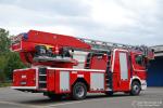 Das Fahrzeug ist bereits mit dem neuen Aufbau und dem neuen Leiterturm ausgestattet.
