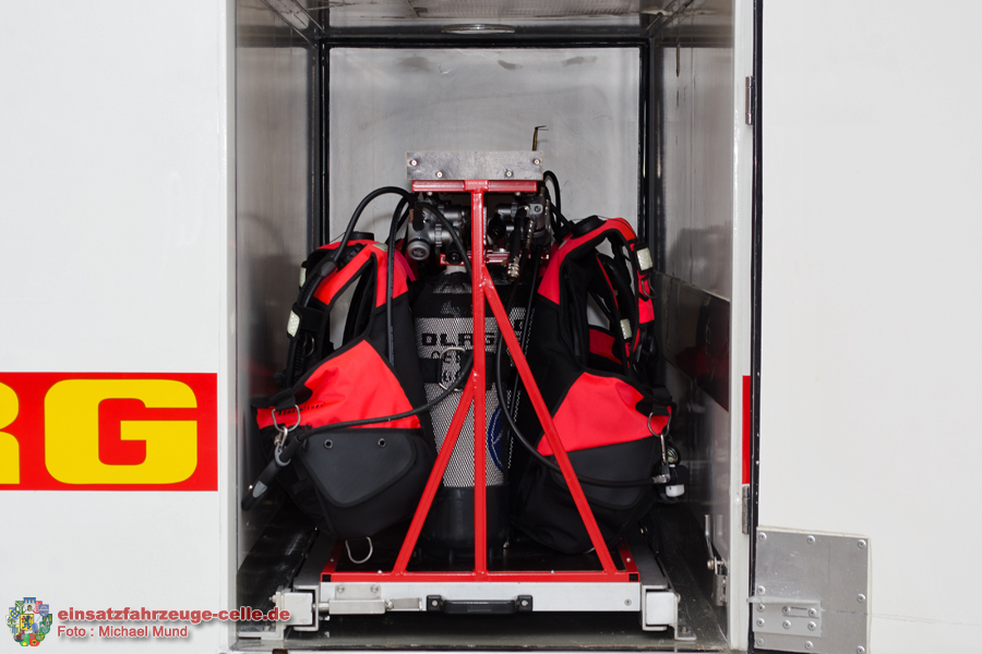 Für den Einatz als Gerätewagen Taucher wurde in den vorderen durchgängigen Geräteraum ein zu beiden Seiten ausziehbarer Auszug eingbaut, welcher dem Transport der Atemluftflaschen der Taucher dient. Im hinteren Kofferbereich wurde einerseits die Ladebordwand entfernt und durch eine PKW-Anhängerkupplung ersetzt. Diese ermöglicht es, dass Schlauchboot der Taunchergruppe mitgezogen werdne kann. Im Inneren des Koffers wurden seitlich zwei Regale verbaut, in welche neben Taucheranzügen das weitere Material für den Taucheinsatz verlastet ist. Hier seien beispielsweise Signal- und Sicherungsleinen, Bleigurte und Masken genannt.